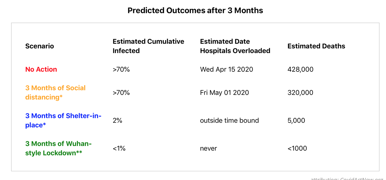 Here's what the projected infection rate and deaths are for California (change the state name in the URL for other states) for the varying degrees of prevention: